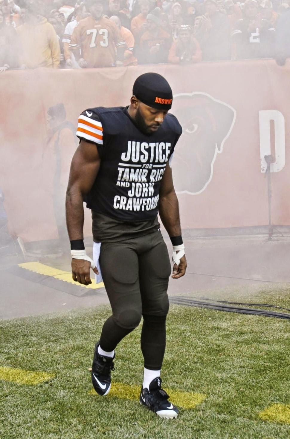Tamir Rice and John Crawford III were the two names on Andrew Hawkins' (the football player) T-shirt. Tamir was a 12 year old little boy sitting in a park all by himself, playing, wandering around, with a toy gun. Two cops drove up and shot him dead. In Cleveland, Ohio. They never gave him a chance. Just shot him dead, that little boy. John Crawford III was 22, inside a Wal-Mart playing with the toys in their toy aisle. Some security guards saw him and shot him dead. Also in Ohio -- this one in Dayton.